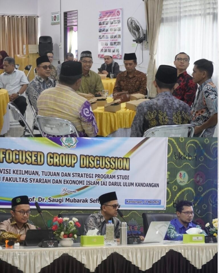 Fakultas Syariah dan Ekonomi Islam IAI Darul Ulum Kandangan mengadakan Focus Group Discussion (FGD) bertema “Visi Keilmuan dan Strategi Program Studi di Lingkungan Fakultas Syariah dan Ekonomi Islam”. Acara yang dilaksanakan di Aula Dinas PPKB Hulu Sungai Selatan ini diikuti oleh pimpinan fakultas, para ketua program studi, tenaga kependidikan, serta menghadirkan narasumber dari UIN Antasari Banjarmasin.